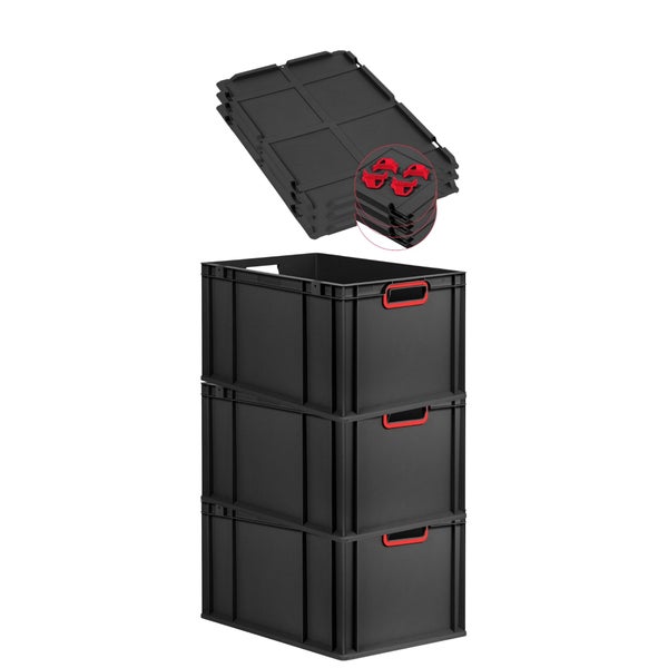 PROREGAL SuperSparSet 3x Eurobox NextGen Color mit Auflagedeckel und Schiebeschnappverschlüsse, HxBxT 32x40x60cm, 65 Liter, Schwarz, Griffe rot offen, Verstärkter Boden, Eurobehälter, Transportbox, Transportbehälter, Stapelbehälter