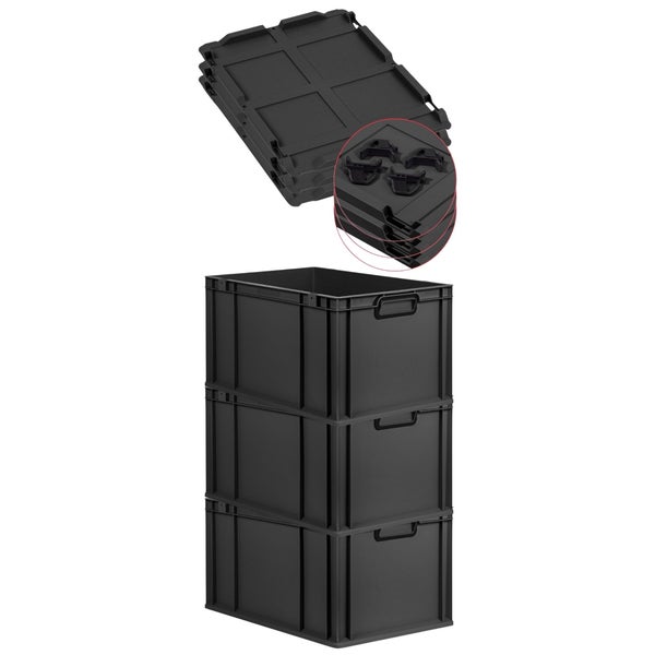 PROREGAL SuperSparSet 3x Eurobox NextGen Color mit Auflagedeckel und Schiebeschnappverschlüsse, HxBxT 32x40x60cm, 65 Liter, Schwarz, Griffe schwarz geschlossen, Verstärkter Boden, Eurobehälter, Transportbox, Transportbehälter, Stapelbehälter