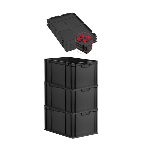 PROREGAL SuperSparSet 3x Eurobox NextGen Grip mit Auflagedeckel inkl. 4 roten Schiebeschnappverschlüssen, HxBxT 32x40x60cm, 65 Liter, Schwarz, Griffe geschlossen, Verstärkter Boden, Eurobehälter, Transportbox, Transportbehälter, Stapelbehälter