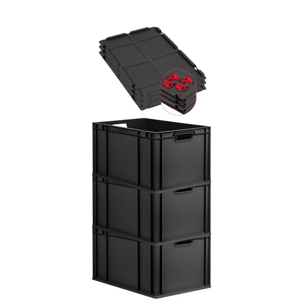 PROREGAL SuperSparSet 3x Eurobox NextGen Grip mit Auflagedeckel inkl. 4 roten Schiebeschnappverschlüssen, HxBxT 32x40x60cm, 65 Liter, Schwarz, Griffe offen, Verstärkter Boden, Eurobehälter, Transportbox, Transportbehälter, Stapelbehälter