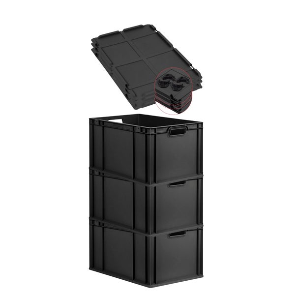 PROREGAL SuperSparSet 3x Eurobox NextGen Grip mit Auflagedeckel inkl. 4 schwarzen Schiebeschnappverschlüssen, HxBxT 32x40x60cm, 65 Liter, Schwarz, Griffe offen, Verstärkter Boden, Eurobehälter, Transportbox, Transportbehälter, Stapelbehälter