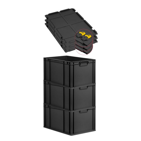 PROREGAL SuperSparSet 3x Eurobox NextGen Grip mit Scharnierdeckel und gelben Schiebeschnappverschlüssen, HxBxT 32x40x60cm, 65 Liter, Schwarz, Griffe geschlossen, Verstärkter Boden, Eurobehälter, Transportbox, Transportbehälter, Stapelbehälter