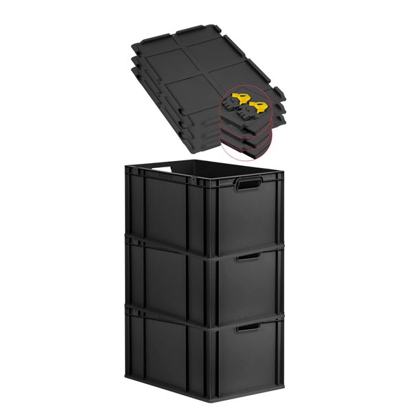 PROREGAL SuperSparSet 3x Eurobox NextGen Grip mit Scharnierdeckel und gelben Schiebeschnappverschlüssen, HxBxT 32x40x60cm, 65 Liter, Schwarz, Griffe offen, Verstärkter Boden, Eurobehälter, Transportbox, Transportbehälter, Stapelbehälter
