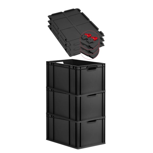 PROREGAL SuperSparSet 3x Eurobox NextGen Grip mit Scharnierdeckel und roten Schiebeschnappverschlüssen, HxBxT 32x40x60cm, 65 Liter, Schwarz, Griffe offen, Verstärkter Boden, Eurobehälter, Transportbox, Transportbehälter, Stapelbehälter
