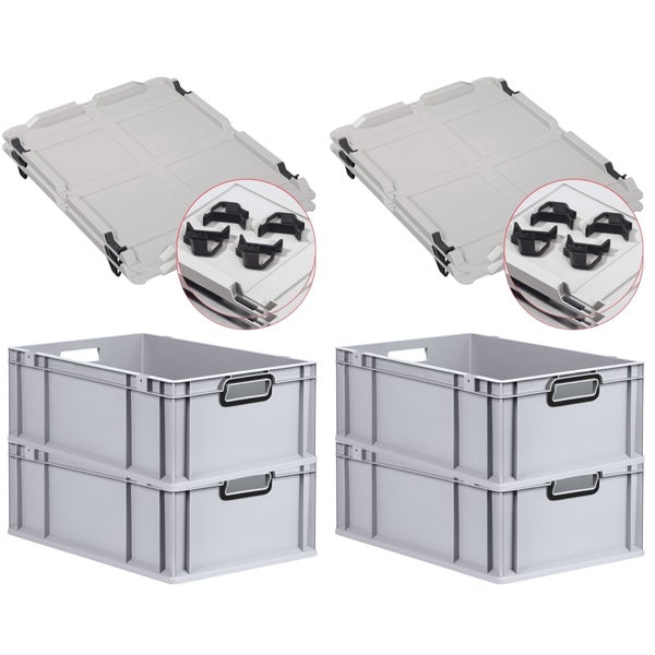 PROREGAL SuperSparSet 4x Eurobox NextGen Color mit Auflagedeckel und Schiebeschnappverschlüsse, HxBxT 22x40x60cm, 44 Liter, Grau, Griffe schwarz offen, Verstärkter Boden, Eurobehälter, Transportbox, Transportbehälter, Stapelbehälter