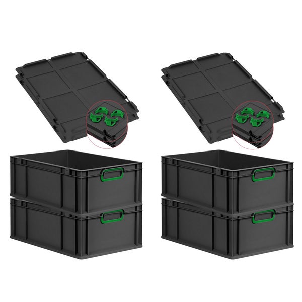 PROREGAL SuperSparSet 4x Eurobox NextGen Color mit Auflagedeckel und Schiebeschnappverschlüsse, HxBxT 22x40x60cm, 44 Liter, Schwarz, Griffe grün geschlossen, Verstärkter Boden, Eurobehälter, Transportbox, Transportbehälter, Stapelbehälter