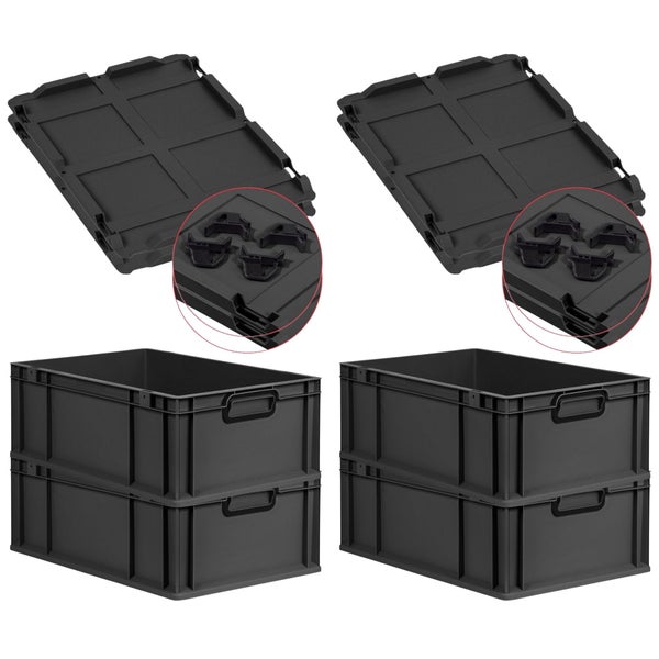 PROREGAL SuperSparSet 4x Eurobox NextGen Color mit Auflagedeckel und Schiebeschnappverschlüsse, HxBxT 22x40x60cm, 44 Liter, Schwarz, Griffe schwarz geschlossen, Verstärkter Boden, Eurobehälter, Transportbox, Transportbehälter, Stapelbehälter