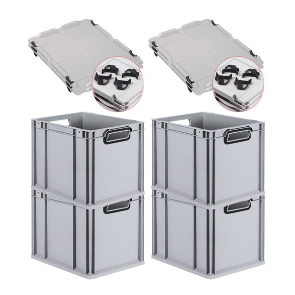 PROREGAL SuperSparSet 4x Eurobox NextGen Color mit Auflagedeckel und Schiebeschnappverschlüsse, HxBxT 32x30x40cm, 30 Liter, Grau, Griffe schwarz offen, Eurobehälter, Transportbox, Transportbehälter, Stapelbehälter
