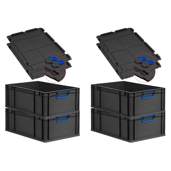 PROREGAL SuperSparSet 4x Eurobox NextGen Color mit Scharnierdeckel und Schiebeschnappverschlüssen, HxBxT 22x40x60cm, 44 Liter, Schwarz, Griffe blau geschlossen, Verstärkter Boden, Eurobehälter, Transportbox, Transportbehälter, Stapelbehälter