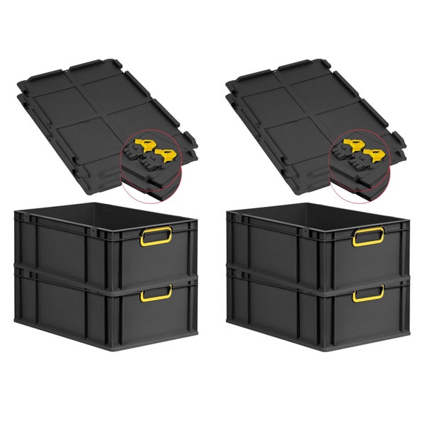 PROREGAL SuperSparSet 4x Eurobox NextGen Color mit Scharnierdeckel und Schiebeschnappverschlüssen, HxBxT 22x40x60cm, 44 Liter, Schwarz, Griffe gelb geschlossen, Verstärkter Boden, Eurobehälter, Transportbox, Transportbehälter, Stapelbehälter