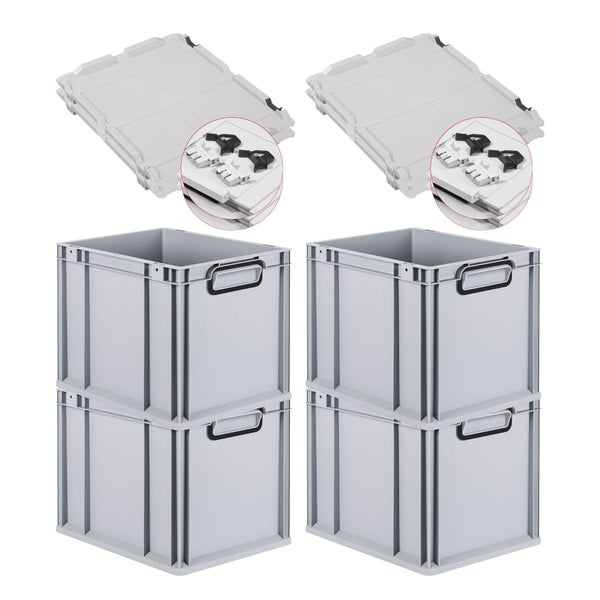PROREGAL SuperSparSet 4x Eurobox NextGen Color mit Scharnierdeckel und Schiebeschnappverschlüssen, HxBxT 32x30x40cm, 30 Liter, Grau, Griffe schwarz geschlossen, Eurobehälter, Transportbox, Transportbehälter, Stapelbehälter