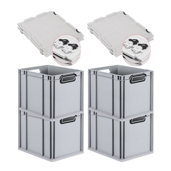 PROREGAL SuperSparSet 4x Eurobox NextGen Color mit Scharnierdeckel und Schiebeschnappverschlüssen, HxBxT 32x30x40cm, 30 Liter, Grau, Griffe schwarz offen, Eurobehälter, Transportbox, Transportbehälter, Stapelbehälter