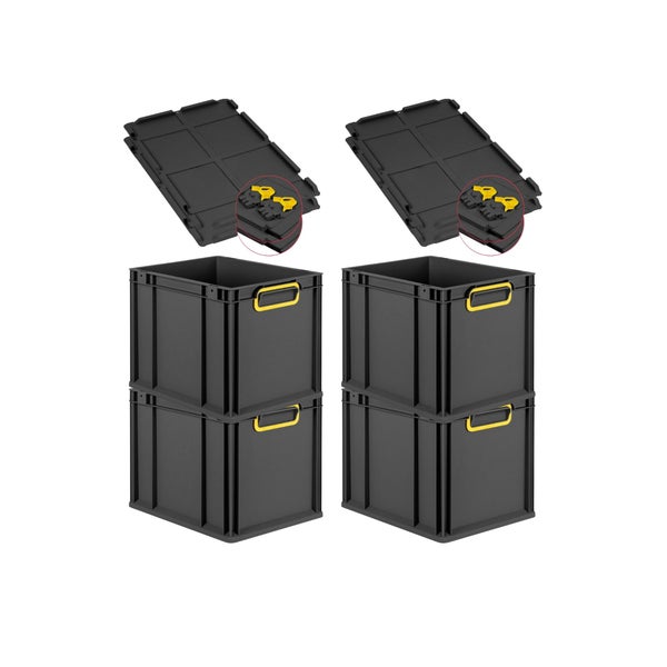 PROREGAL SuperSparSet 4x Eurobox NextGen Color mit Scharnierdeckel und Schiebeschnappverschlüssen, HxBxT 32x30x40cm, 30 Liter, Schwarz, Griffe gelb geschlossen, Eurobehälter, Transportbox, Transportbehälter, Stapelbehälter
