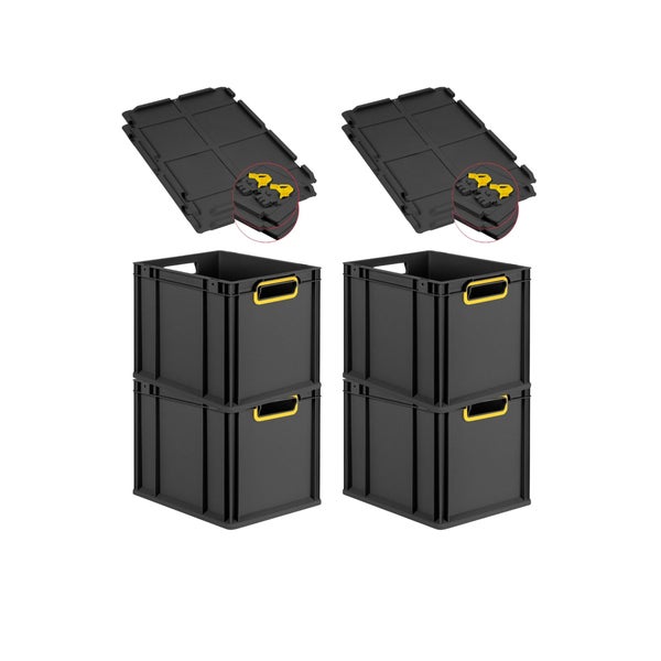 PROREGAL SuperSparSet 4x Eurobox NextGen Color mit Scharnierdeckel und Schiebeschnappverschlüssen, HxBxT 32x30x40cm, 30 Liter, Schwarz, Griffe gelb offen, Eurobehälter, Transportbox, Transportbehälter, Stapelbehälter