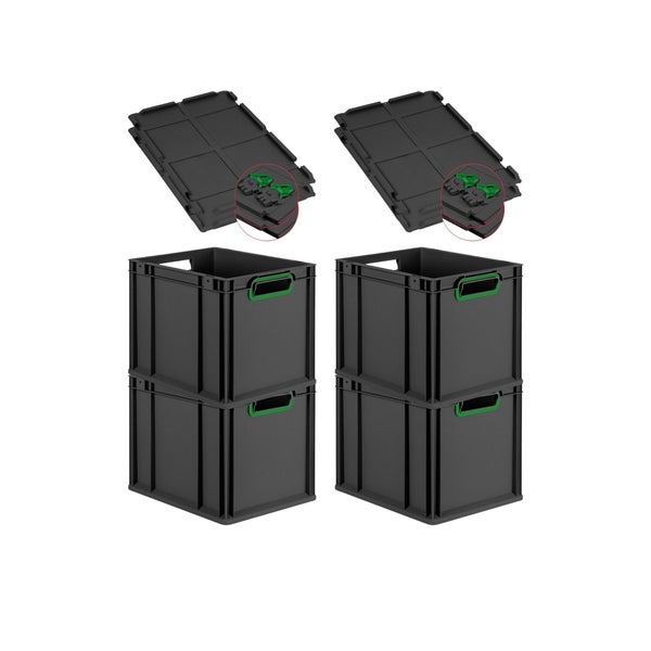 PROREGAL SuperSparSet 4x Eurobox NextGen Color mit Scharnierdeckel und Schiebeschnappverschlüssen, HxBxT 32x30x40cm, 30 Liter, Schwarz, Griffe grün offen, Eurobehälter, Transportbox, Transportbehälter, Stapelbehälter