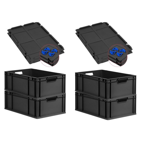 PROREGAL SuperSparSet 4x Eurobox NextGen Grip mit Auflagedeckel inkl. 4 blauen Schiebeschnappverschlüssen, HxBxT 22x40x60cm, 44 Liter, Schwarz, Griffe offen, Verstärkter Boden, Eurobehälter, Transportbox, Transportbehälter, Stapelbehälter
