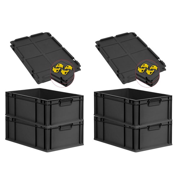 PROREGAL SuperSparSet 4x Eurobox NextGen Grip mit Auflagedeckel inkl. 4 gelben Schiebeschnappverschlüssen, HxBxT 22x40x60cm, 44 Liter, Schwarz, Griffe geschlossen, Verstärkter Boden, Eurobehälter, Transportbox, Transportbehälter, Stapelbehälter