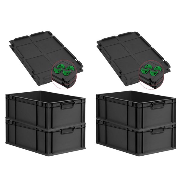 PROREGAL SuperSparSet 4x Eurobox NextGen Grip mit Auflagedeckel inkl. 4 grünen Schiebeschnappverschlüssen, HxBxT 22x40x60cm, 44 Liter, Schwarz, Griffe geschlossen, Verstärkter Boden, Eurobehälter, Transportbox, Transportbehälter, Stapelbehälter