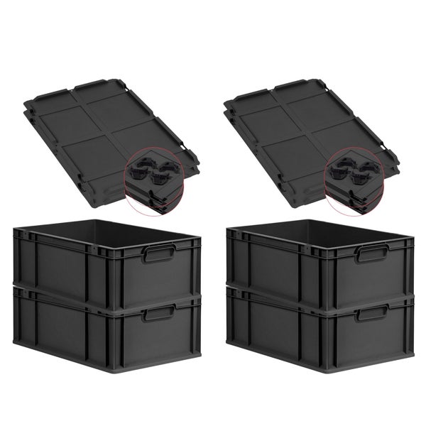 PROREGAL SuperSparSet 4x Eurobox NextGen Grip mit Auflagedeckel inkl. 4 schwarzen Schiebeschnappverschlüssen, HxBxT 22x40x60cm, 44 Liter, Schwarz, Griffe geschlossen, Verstärkter Boden, Eurobehälter, Transportbox, Transportbehälter, Stapelbehälter