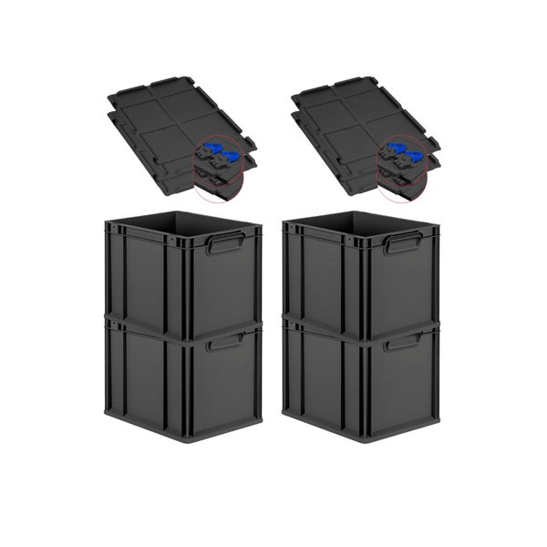 PROREGAL SuperSparSet 4x Eurobox NextGen Grip mit Scharnierdeckel und blauen Schiebeschnappverschlüssen, HxBxT 32x30x40cm, 30 Liter, Schwarz, Griffe geschlossen, Eurobehälter, Transportbox, Transportbehälter, Stapelbehälter