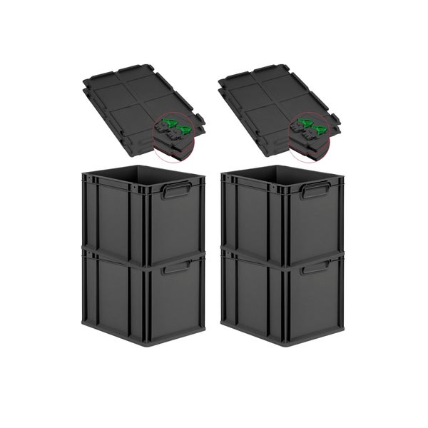 PROREGAL SuperSparSet 4x Eurobox NextGen Grip mit Scharnierdeckel und grünen Schiebeschnappverschlüssen, HxBxT 32x30x40cm, 30 Liter, Schwarz, Griffe geschlossen, Eurobehälter, Transportbox, Transportbehälter, Stapelbehälter