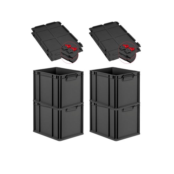 PROREGAL SuperSparSet 4x Eurobox NextGen Grip mit Scharnierdeckel und roten Schiebeschnappverschlüssen, HxBxT 32x30x40cm, 30 Liter, Schwarz, Griffe geschlossen, Eurobehälter, Transportbox, Transportbehälter, Stapelbehälter