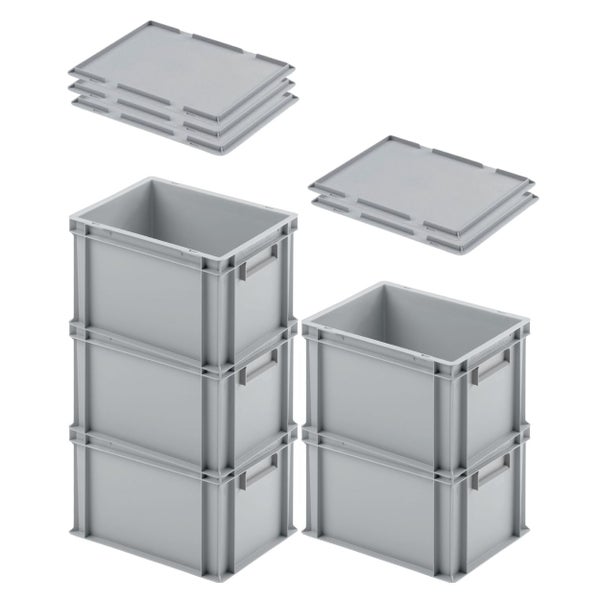 PROREGAL SuperSparSet 5 x Eurobehälter Mit Geschlossenem Griff und Auflagedeckel HxBxT 23,5 x 30 x 40 cm 22 Liter Grau Eurobox Transportbox