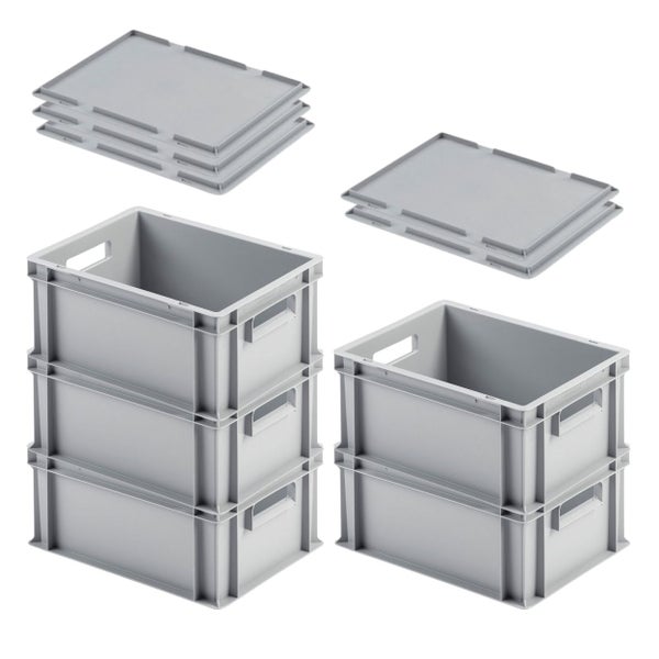 PROREGAL SuperSparSet 5 x Eurobehälter Mit Offenem Griff und Auflagedeckel HxBxT 17,5 x 30 x 40 cm 16 Liter Grau Eurobox Transportbox