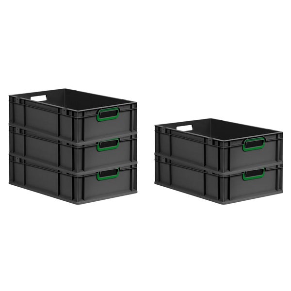 PROREGAL SuperSparSet 5x Eurobox NextGen Color, HxBxT 17x40x60cm, 34 Liter, Griffe grün offen, Schwarz, Eurobehälter, Transportbox, Transportbehälter, Stapelbehälter