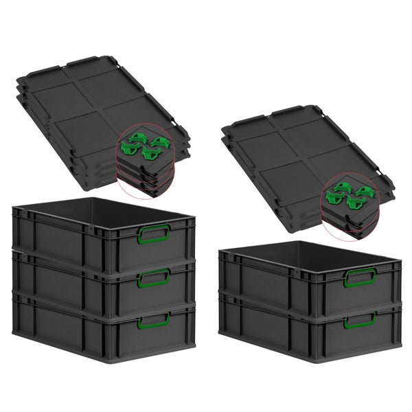 PROREGAL SuperSparSet 5x Eurobox NextGen Color mit Auflagedeckel und Schiebeschnappverschlüsse, HxBxT 17x40x60cm, 34 Liter, Schwarz, Griffe grün geschlossen, Eurobehälter, Transportbox, Transportbehälter, Stapelbehälter
