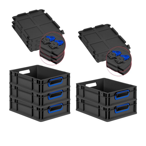 PROREGAL SuperSparSet 5x Eurobox NextGen Color mit Scharnierdeckel und Schiebeschnappverschlüssen, HxBxT 12x30x40cm, 11 Liter, Schwarz, Griffe blau offen, Eurobehälter, Transportbox, Transportbehälter, Stapelbehälter