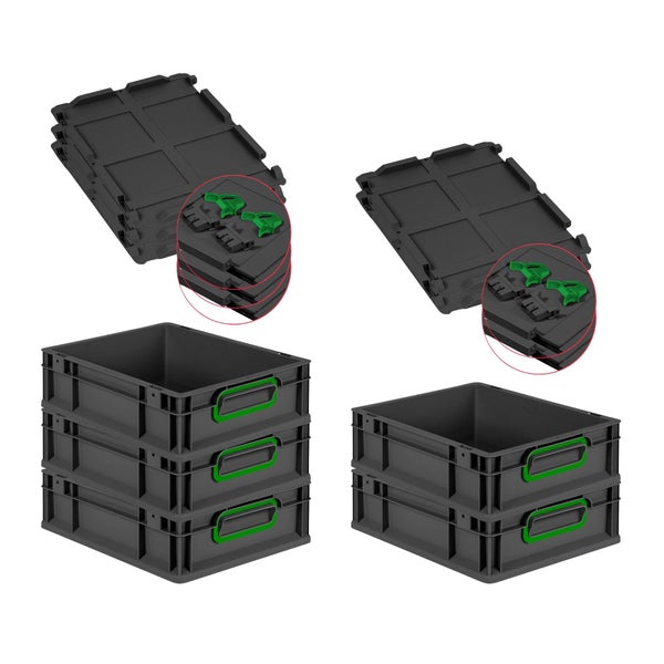 PROREGAL SuperSparSet 5x Eurobox NextGen Color mit Scharnierdeckel und Schiebeschnappverschlüssen, HxBxT 12x30x40cm, 11 Liter, Schwarz, Griffe grün geschlossen, Eurobehälter, Transportbox, Transportbehälter, Stapelbehälter