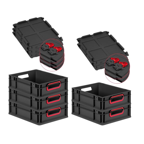 PROREGAL SuperSparSet 5x Eurobox NextGen Color mit Scharnierdeckel und Schiebeschnappverschlüssen, HxBxT 12x30x40cm, 11 Liter, Schwarz, Griffe rot offen, Eurobehälter, Transportbox, Transportbehälter, Stapelbehälter