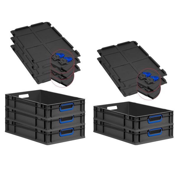PROREGAL SuperSparSet 5x Eurobox NextGen Color mit Scharnierdeckel und Schiebeschnappverschlüssen, HxBxT 12x40x60cm, 23 Liter, Schwarz, Griffe blau offen, Eurobehälter, Transportbox, Transportbehälter, Stapelbehälter