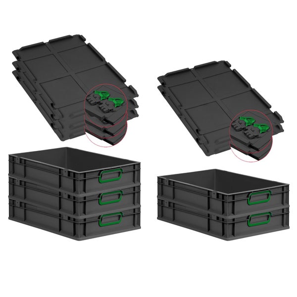 PROREGAL SuperSparSet 5x Eurobox NextGen Color mit Scharnierdeckel und Schiebeschnappverschlüssen, HxBxT 12x40x60cm, 23 Liter, Schwarz, Griffe grün geschlossen, Eurobehälter, Transportbox, Transportbehälter, Stapelbehälter