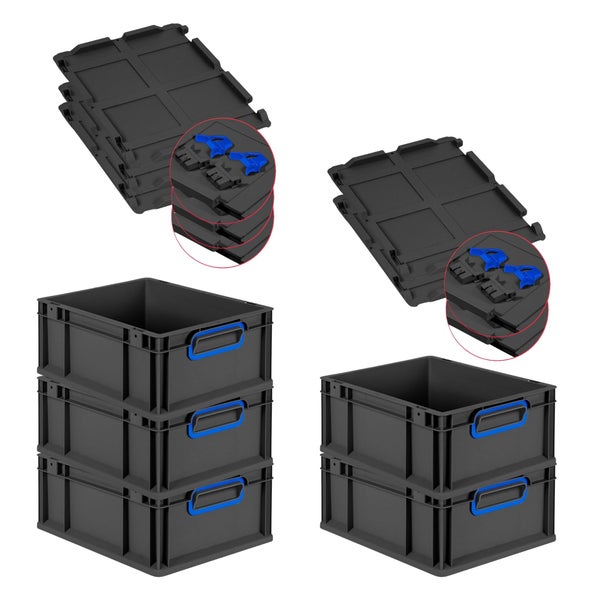PROREGAL SuperSparSet 5x Eurobox NextGen Color mit Scharnierdeckel und Schiebeschnappverschlüssen, HxBxT 17x30x40cm, 16 Liter, Schwarz, Griffe blau geschlossen, Eurobehälter, Transportbox, Transportbehälter, Stapelbehälter