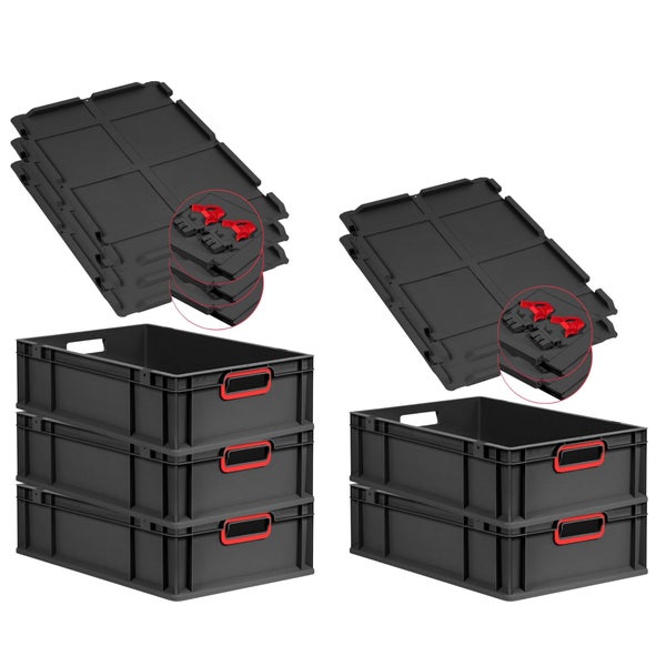 PROREGAL SuperSparSet 5x Eurobox NextGen Color mit Scharnierdeckel und Schiebeschnappverschlüssen, HxBxT 17x40x60cm, 34 Liter, Schwarz, Griffe rot offen, Eurobehälter, Transportbox, Transportbehälter, Stapelbehälter
