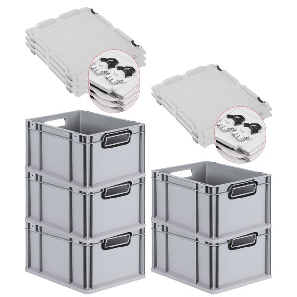 PROREGAL SuperSparSet 5x Eurobox NextGen Color mit Scharnierdeckel und Schiebeschnappverschlüssen, HxBxT 22x30x40cm, 20 Liter, Grau, Griffe schwarz offen, Eurobehälter, Transportbox, Transportbehälter, Stapelbehälter