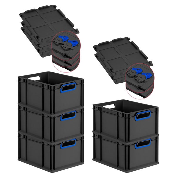 PROREGAL SuperSparSet 5x Eurobox NextGen Color mit Scharnierdeckel und Schiebeschnappverschlüssen, HxBxT 22x30x40cm, 20 Liter, Schwarz, Griffe blau offen, Eurobehälter, Transportbox, Transportbehälter, Stapelbehälter