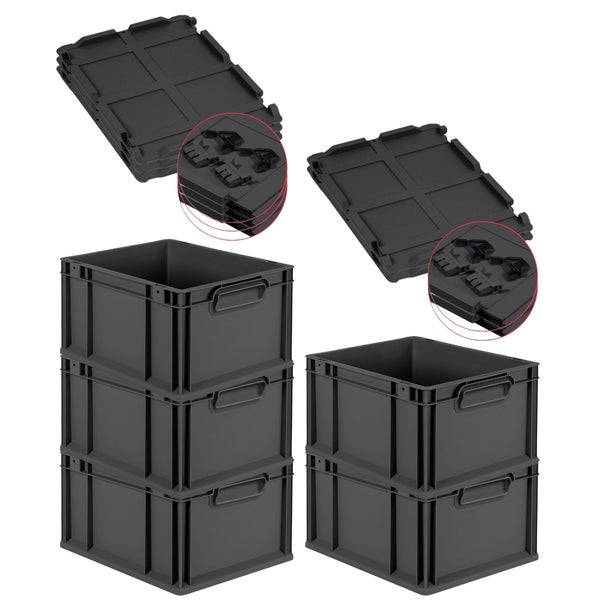 PROREGAL SuperSparSet 5x Eurobox NextGen Color mit Scharnierdeckel und Schiebeschnappverschlüssen, HxBxT 22x30x40cm, 20 Liter, Schwarz, Griffe schwarz geschlossen, Eurobehälter, Transportbox, Transportbehälter, Stapelbehälter