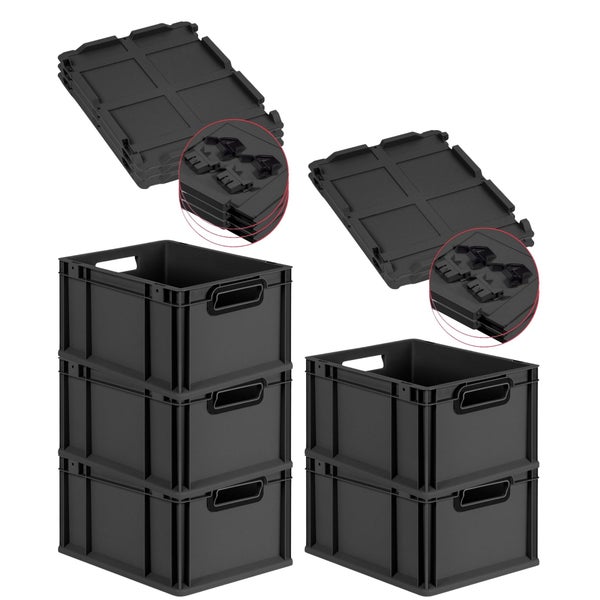 PROREGAL SuperSparSet 5x Eurobox NextGen Color mit Scharnierdeckel und Schiebeschnappverschlüssen, HxBxT 22x30x40cm, 20 Liter, Schwarz, Griffe schwarz offen, Eurobehälter, Transportbox, Transportbehälter, Stapelbehälter