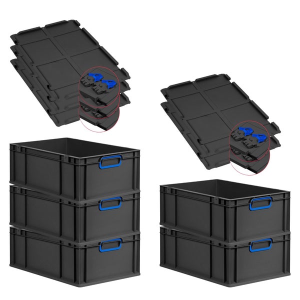 PROREGAL SuperSparSet 5x Eurobox NextGen Color mit Scharnierdeckel und Schiebeschnappverschlüssen, HxBxT 22x40x60cm, 44 Liter, Schwarz, Griffe blau geschlossen, Verstärkter Boden, Eurobehälter, Transportbox, Transportbehälter, Stapelbehälter