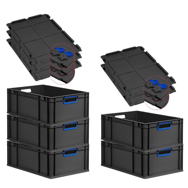 PROREGAL SuperSparSet 5x Eurobox NextGen Color mit Scharnierdeckel und Schiebeschnappverschlüssen, HxBxT 22x40x60cm, 44 Liter, Schwarz, Griffe blau offen, Verstärkter Boden, Eurobehälter, Transportbox, Transportbehälter, Stapelbehälter