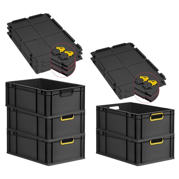 PROREGAL SuperSparSet 5x Eurobox NextGen Color mit Scharnierdeckel und Schiebeschnappverschlüssen, HxBxT 22x40x60cm, 44 Liter, Schwarz, Griffe gelb offen, Verstärkter Boden, Eurobehälter, Transportbox, Transportbehälter, Stapelbehälter