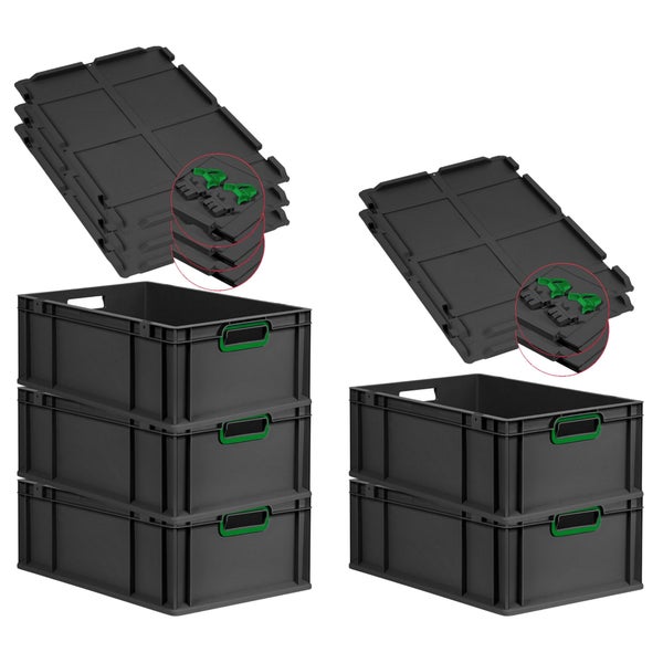 PROREGAL SuperSparSet 5x Eurobox NextGen Color mit Scharnierdeckel und Schiebeschnappverschlüssen, HxBxT 22x40x60cm, 44 Liter, Schwarz, Griffe grün offen, Verstärkter Boden, Eurobehälter, Transportbox, Transportbehälter, Stapelbehälter