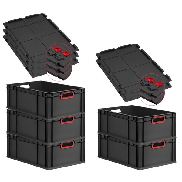 PROREGAL SuperSparSet 5x Eurobox NextGen Color mit Scharnierdeckel und Schiebeschnappverschlüssen, HxBxT 22x40x60cm, 44 Liter, Schwarz, Griffe rot offen, Verstärkter Boden, Eurobehälter, Transportbox, Transportbehälter, Stapelbehälter