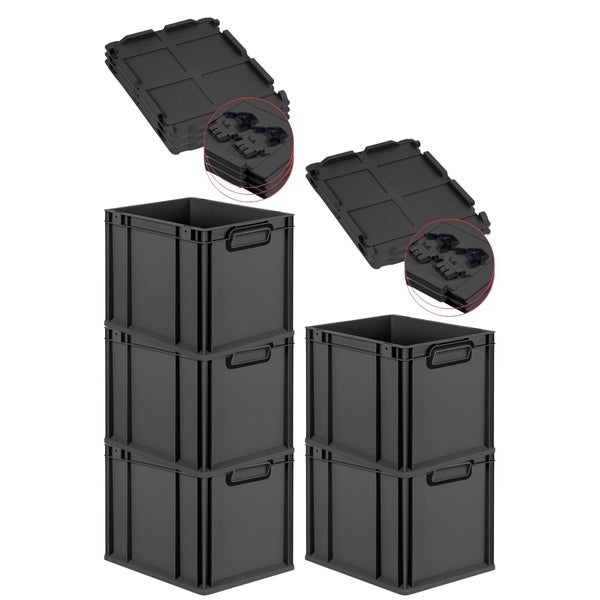 PROREGAL SuperSparSet 5x Eurobox NextGen Color mit Scharnierdeckel und Schiebeschnappverschlüssen, HxBxT 32x30x40cm, 30 Liter, Schwarz, Griffe schwarz geschlossen, Eurobehälter, Transportbox, Transportbehälter, Stapelbehälter