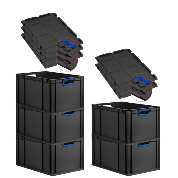 PROREGAL SuperSparSet 5x Eurobox NextGen Color mit Scharnierdeckel und Schiebeschnappverschlüssen, HxBxT 32x40x60cm, 65 Liter, Schwarz, Griffe blau offen, Verstärkter Boden, Eurobehälter, Transportbox, Transportbehälter, Stapelbehälter