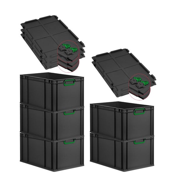 PROREGAL SuperSparSet 5x Eurobox NextGen Color mit Scharnierdeckel und Schiebeschnappverschlüssen, HxBxT 32x40x60cm, 65 Liter, Schwarz, Griffe grün geschlossen, Verstärkter Boden, Eurobehälter, Transportbox, Transportbehälter, Stapelbehälter
