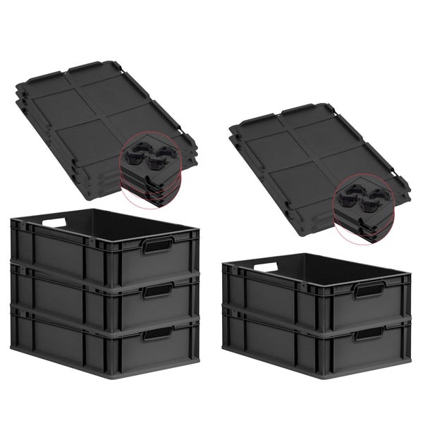 PROREGAL SuperSparSet 5x Eurobox NextGen Grip mit Auflagedeckel inkl. 4 schwarzen Schiebeschnappverschlüssen, HxBxT 17x40x60cm, 34 Liter, Schwarz, Griffe offen, Eurobehälter, Transportbox, Transportbehälter, Stapelbehälter